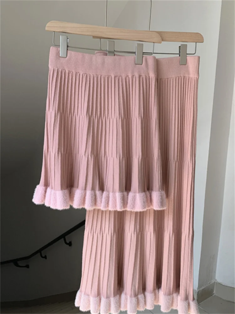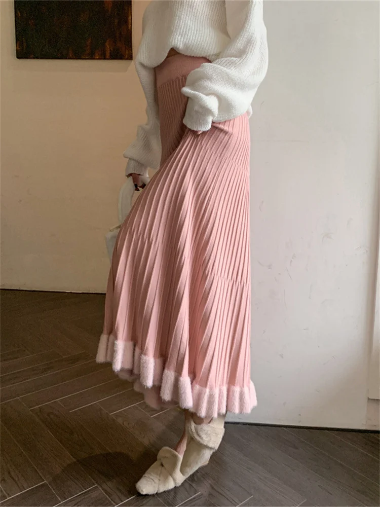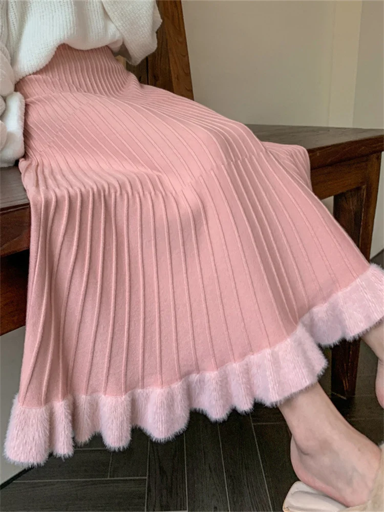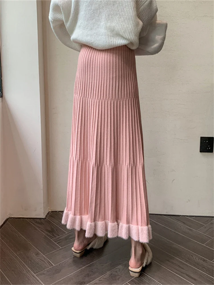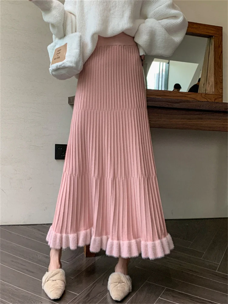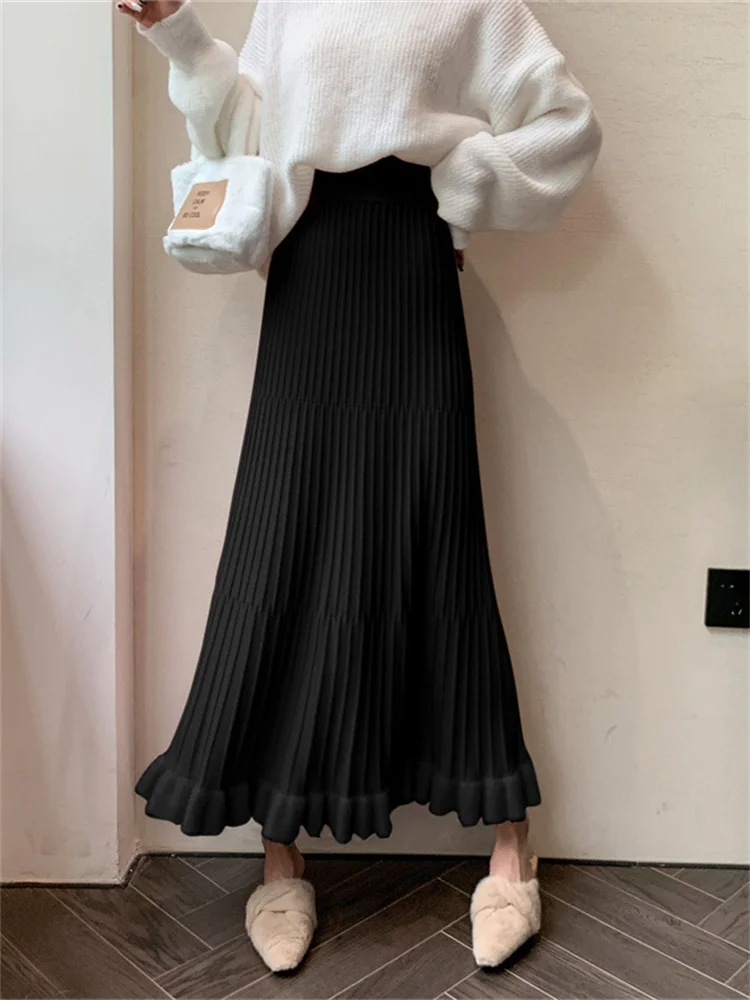 High Waist Ruffled Pleated Skirts Women Solid Autumn Elegant Long Skirt Loose Pleated Ribbed Casual Ladies Maxi Skirt