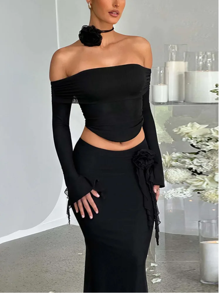 Ootddress Winter New Sexy Long Sleeved Half Skirt Set For Woman 3D Flower Slim Tight Long Skirt Party Evening Dress Two Piece Set