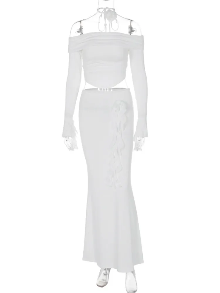 Winter New Sexy Long Sleeved Half Skirt Set For Woman 3D Flower Slim Tight Long Skirt Party Evening Dress Two Piece Set