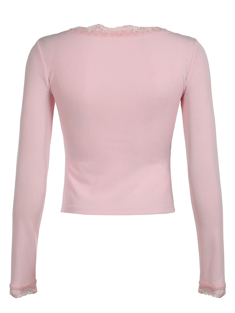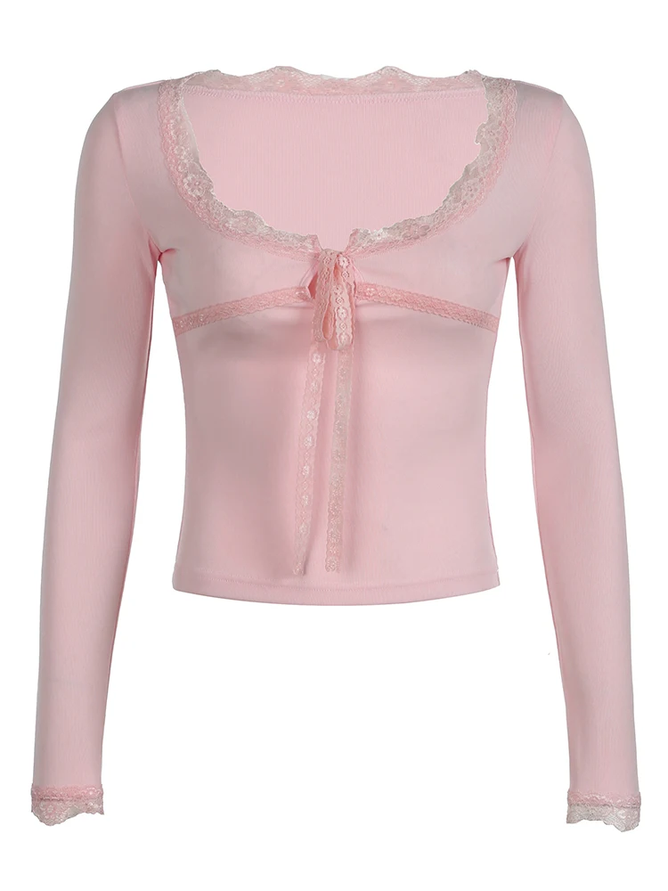 Pink Sweet Basic Slim Long Sleeve Tees Top T Shirts Women Cross Tie Lace Patchwork Cute Japanese Kawaii Y2K Clothes