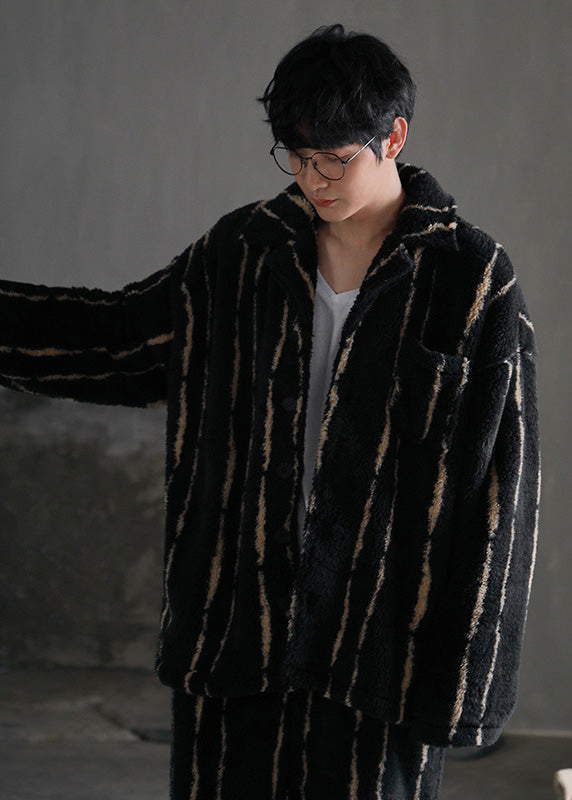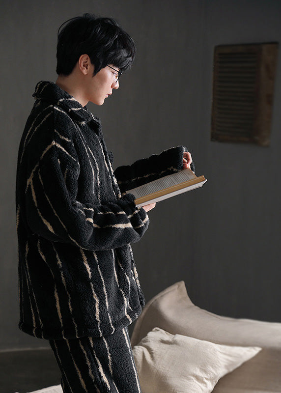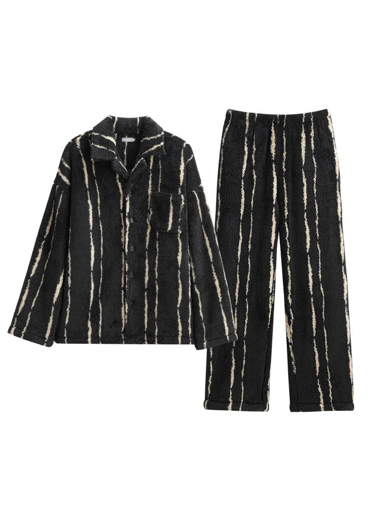 Plus Size Black Striped Patchwork Button Velour Pajamas Two Piece Set Spring