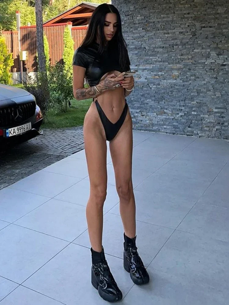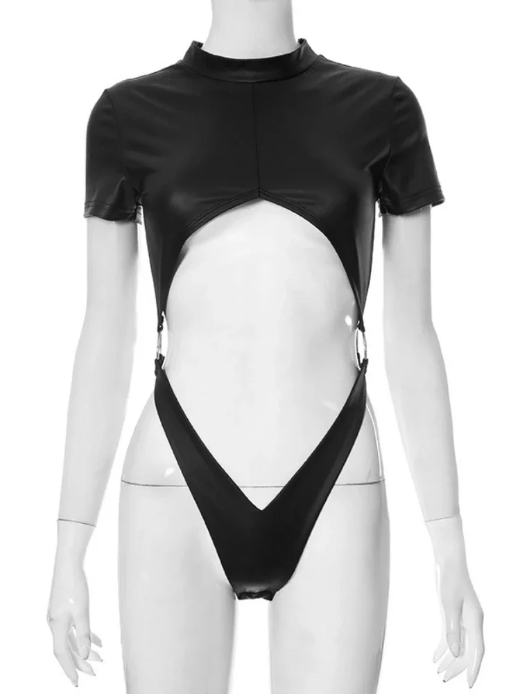 PU Sexy Bodysuit Lingerie Black Top Women Rave Outfit Short Sleeve Body Feminino Hollow Out One-Pieces Lenceria Bodys Sexy Mujer