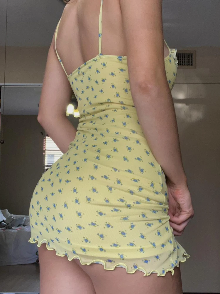 Ruffles Tie Floral Print Cute Y2K Summer Dress Women Sleeveless Two Layer Mesh Spaghetti Straps Dresses
