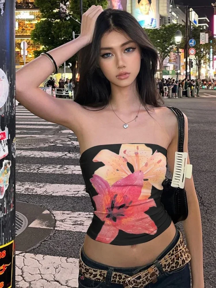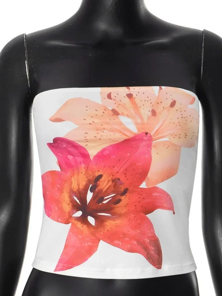 Sexy Floral Print Bustier Short Strapless Top One-Piece Sleeveless Slim-Fit Fashion Tops For Women Casual Neckless Y2k Bra Top