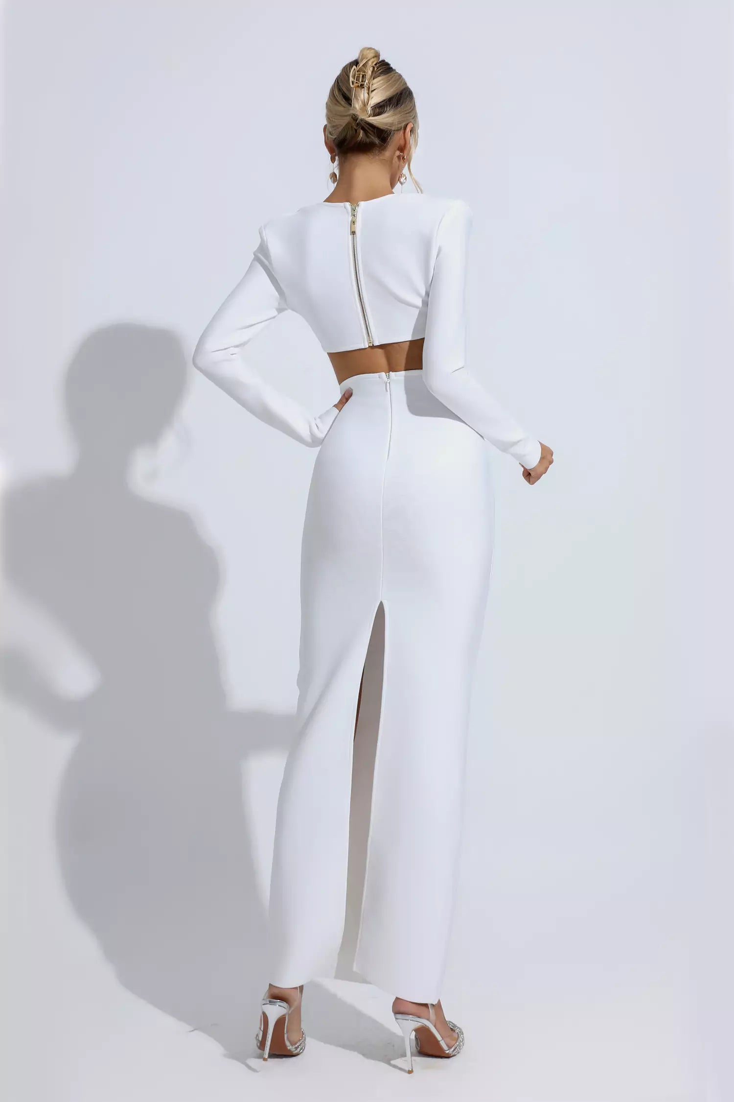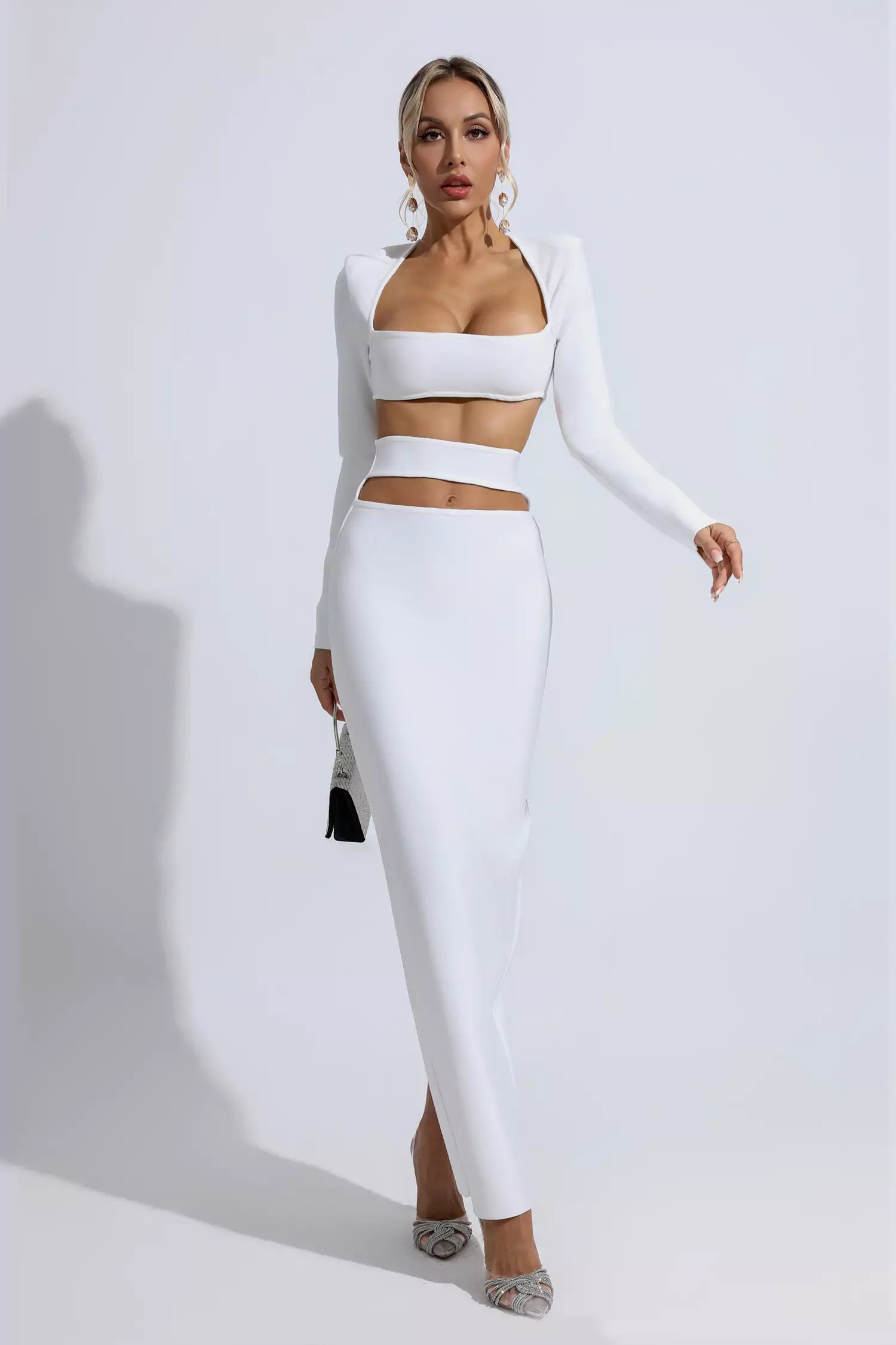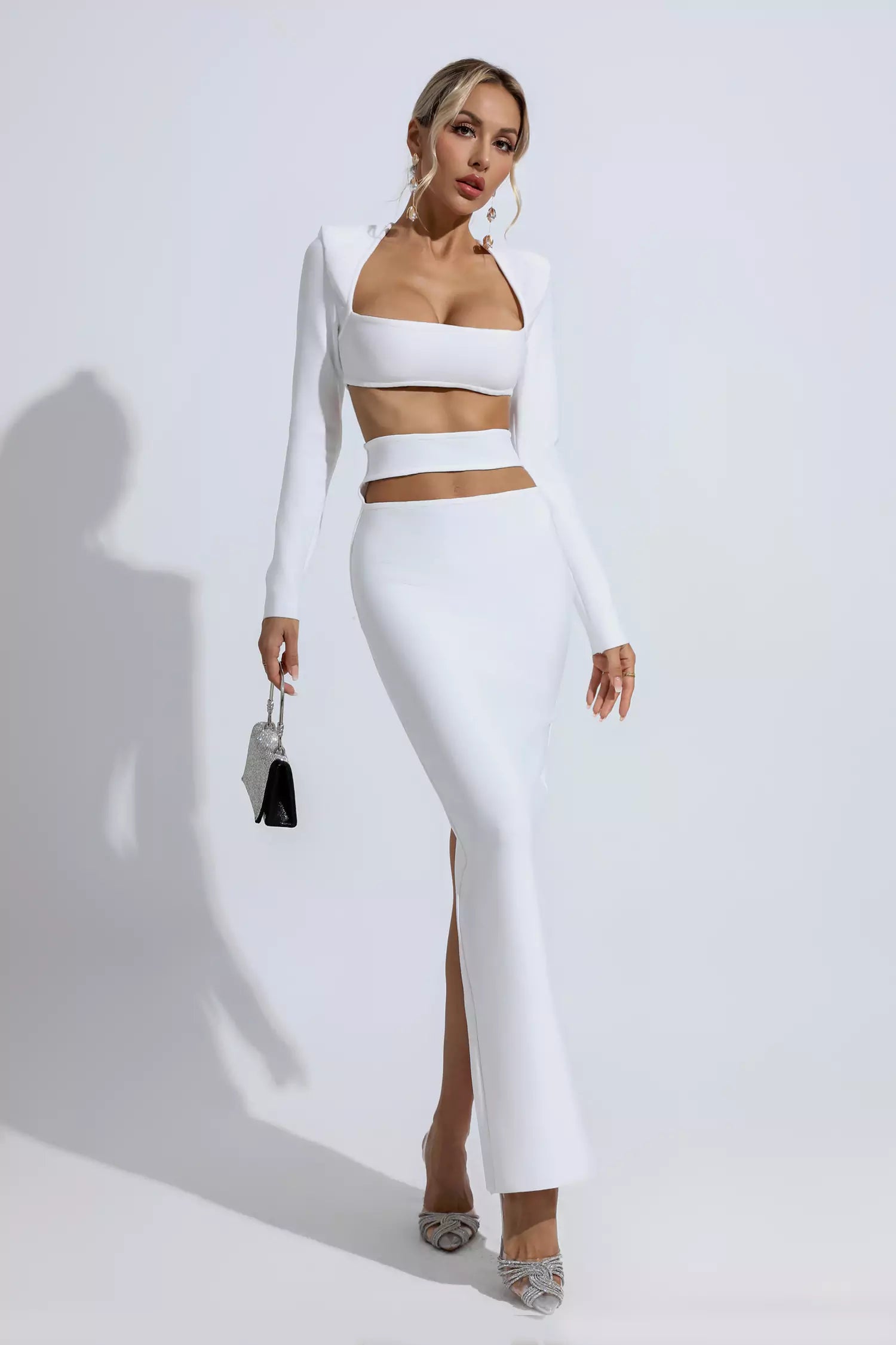 All eyes will be on you in our Sutton White Bandage Set. This bandage set makes a statement in white bandage fabric, an exposed waist and a classic square neckline. Show your body's natural curves in this maxi dress for sensual appeal. Complete your stylish look with a handbag and heels!
