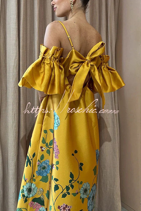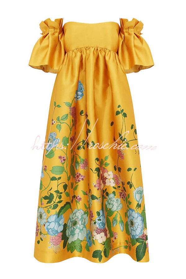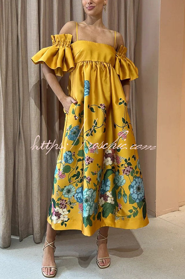 Sweetest Marigold Printed Gathered Sleeve Pocketed A-line Midi Dress