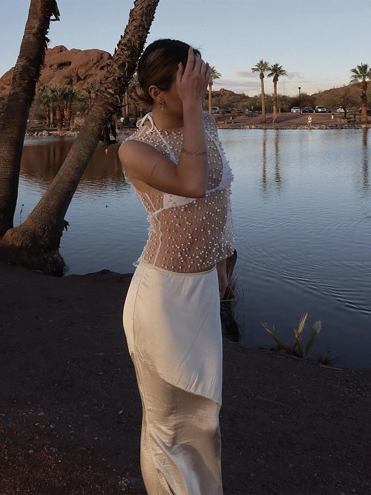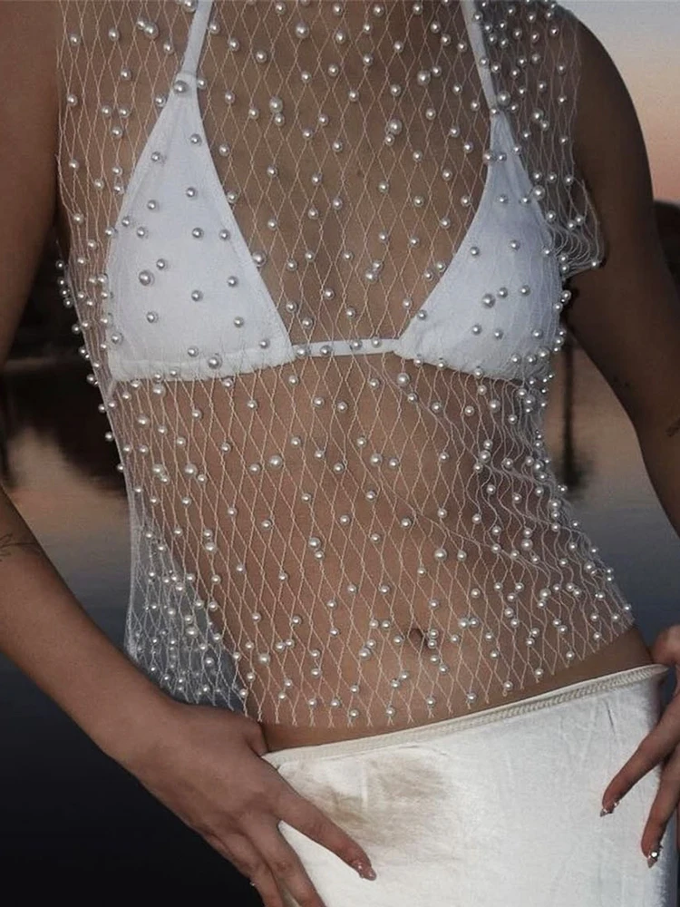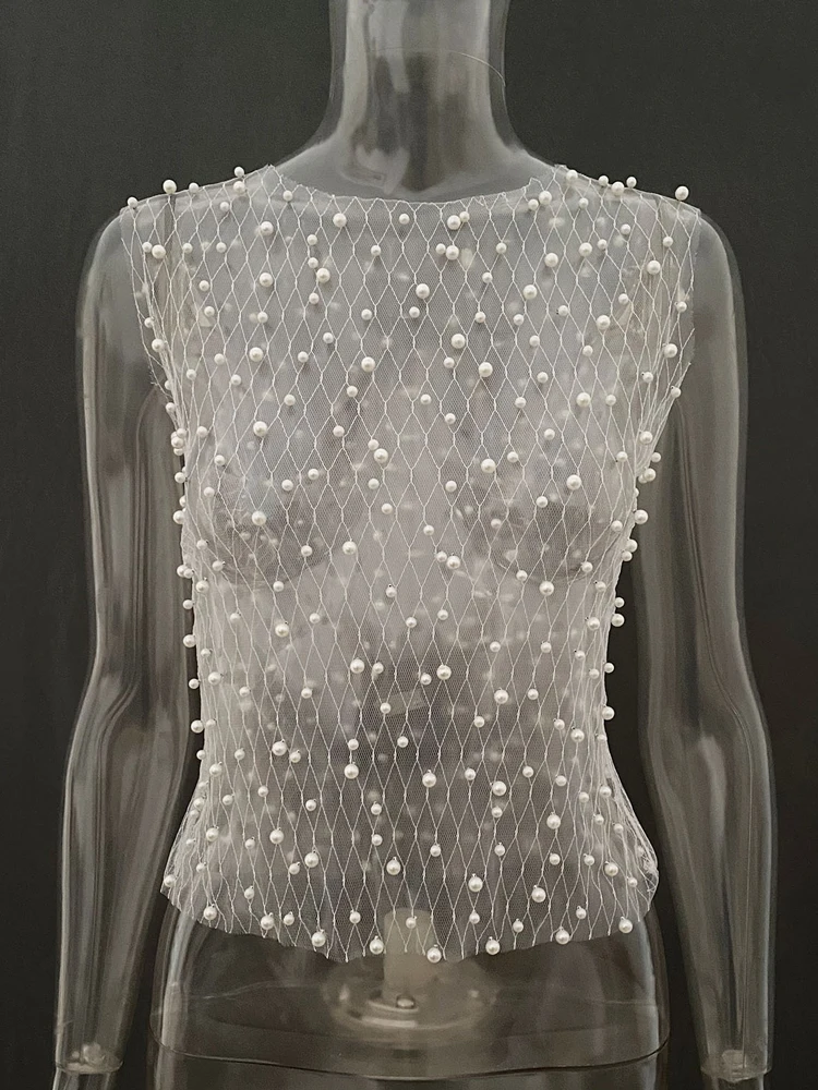 Pearl Mesh See-Through Women Tank Top Sexy Sleeveless Round Neck Losse Summer Short T-shirt Female Y2K Fashion Vest 2025