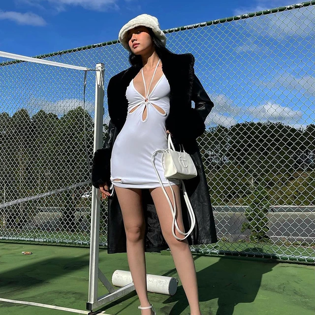 Ootddress White Hollow Out Mini Dresses Summer Sexy Bodycon Backless Party Dress Skinny Sleeveless Night Club Beach Dress
