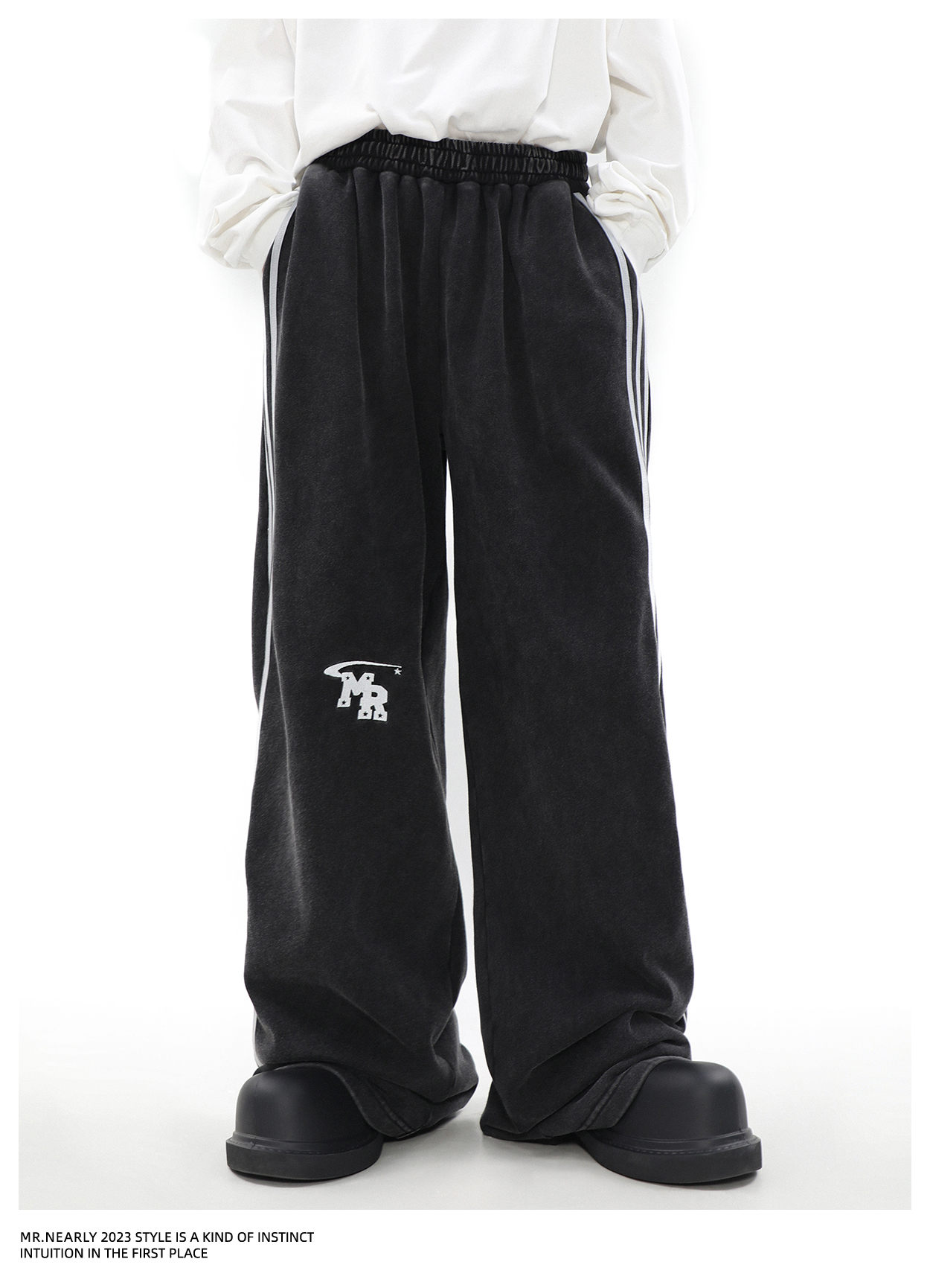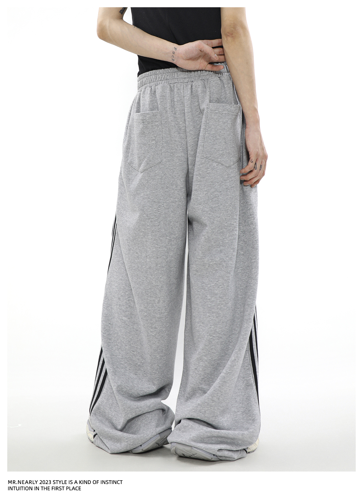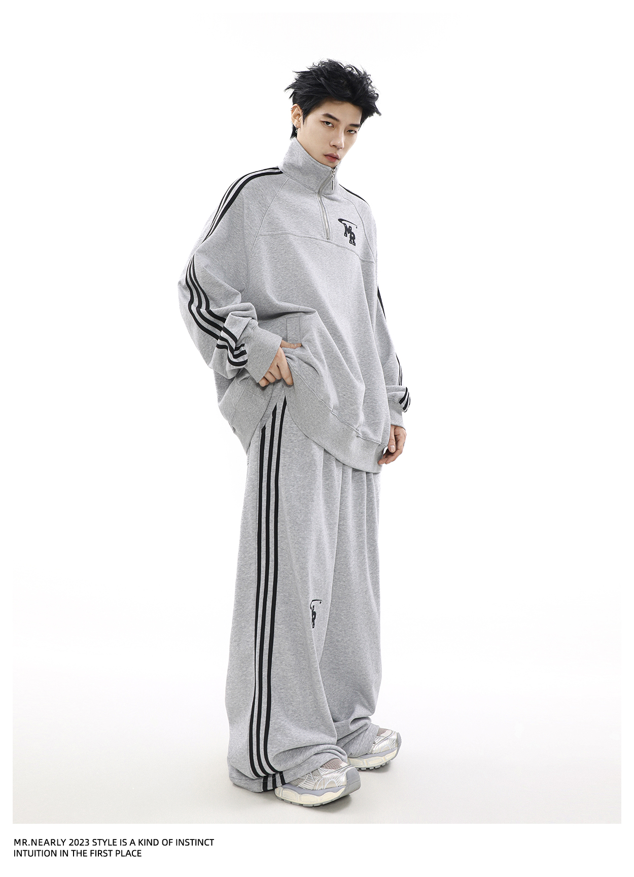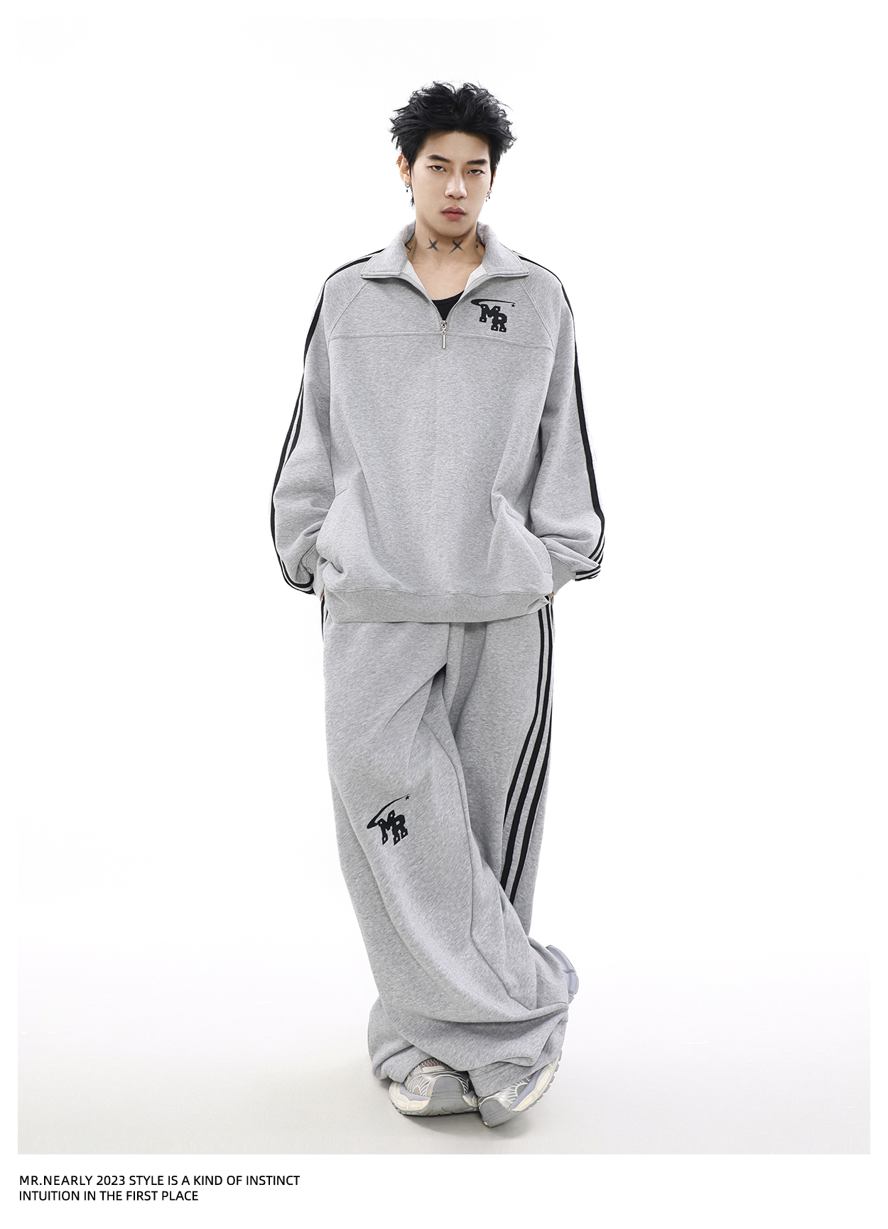 The "Urban Edge Athleisure Set" offers a stylish blend of comfort and street style. Featuring a soft grey zip-up jacket with a subtle chest emblem and matching drawstring pants with sleek side stripes. This tracksuit is perfect for versatile, everyday wear._