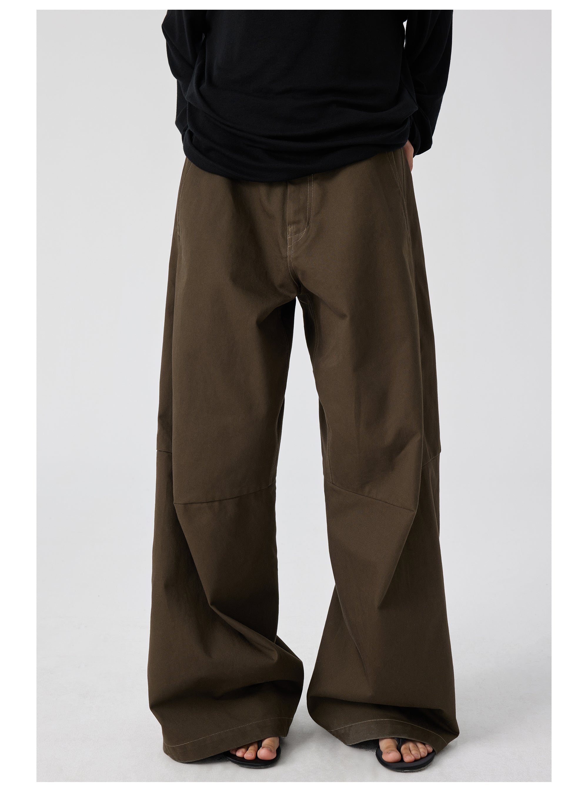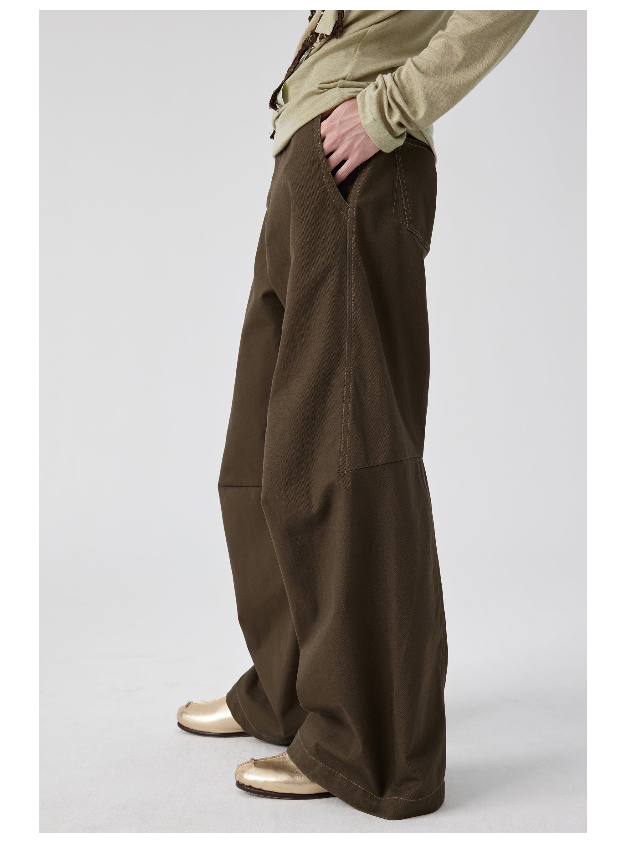 Wide-Leg Cotton Trousers with Darted Knees - Elevate your style with these wide, drapey fit trousers, perfect for both men and women. Featuring additional seams on the knees, a mid-rise waist, and a flared, extended hem, these trousers offer a classic and versatile look. Made from 100% thick textured cotton, they come with belt loops, a zipper & button closure, and are available in Olive and Black. Recommended to size up as they run small.