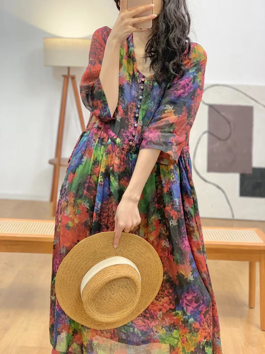 Made from luxurious linen fabric, this dress boasts a trendy V-neck and elegant floral design. The regular half sleeves offer comfortable coverage, while the calf-length adds versatility to this summer essential.